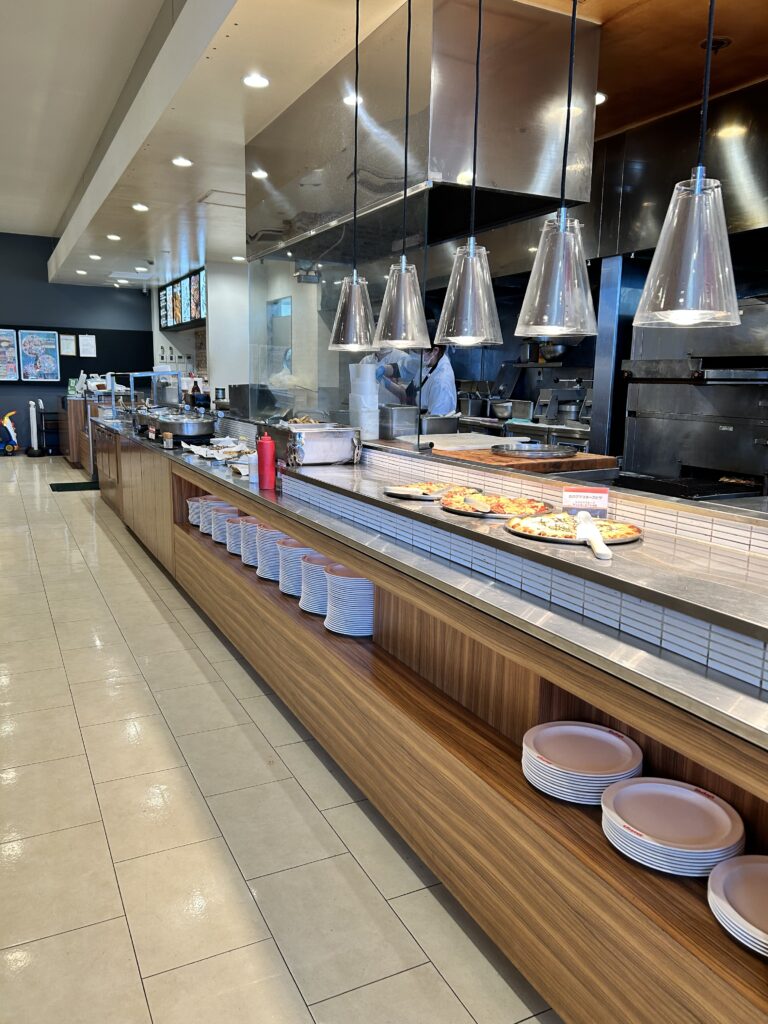 ビュッフェスタイルで、色んなピザや食事が並べられています